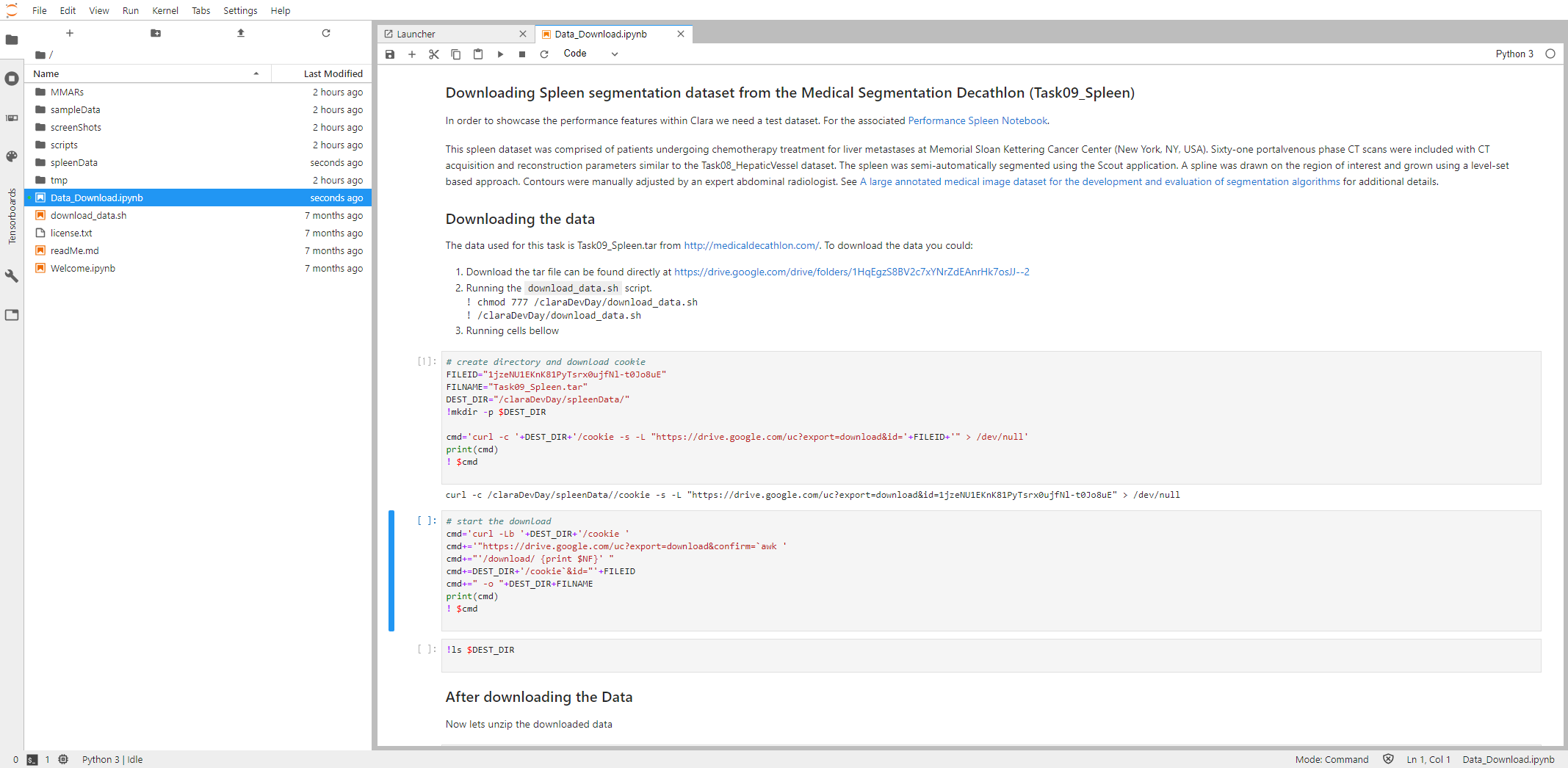 となります。最後の段からは、リンクに張っている、Clara Train Live-Demo というドキュメントに沿って説明されるのですが、まず最初のデモを実行するファイル群がダウンロードできません。ただ、このセミナー自体は、