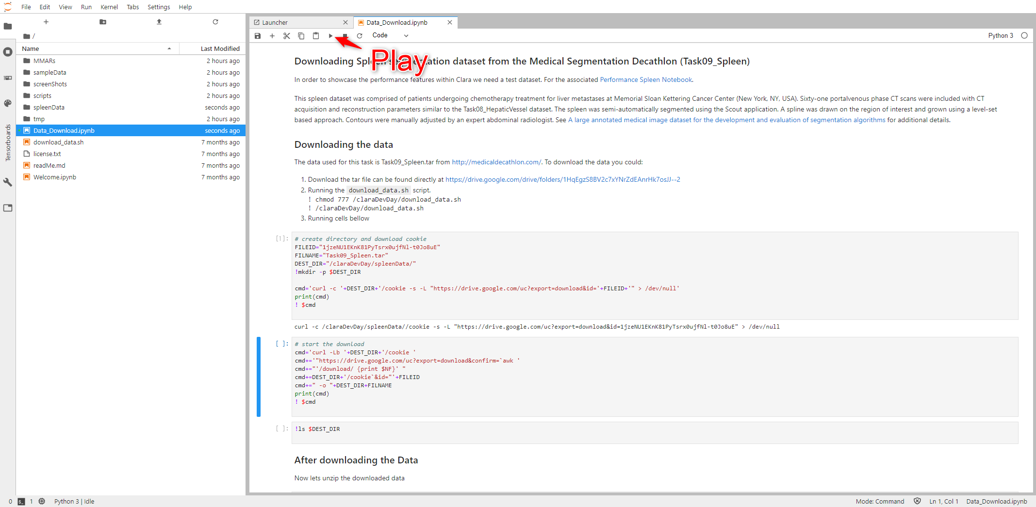 まずはデータをダウンロードしてみましょう。書かれている通りにステップを踏むだけですので、Play ボタンを押していきましょう。