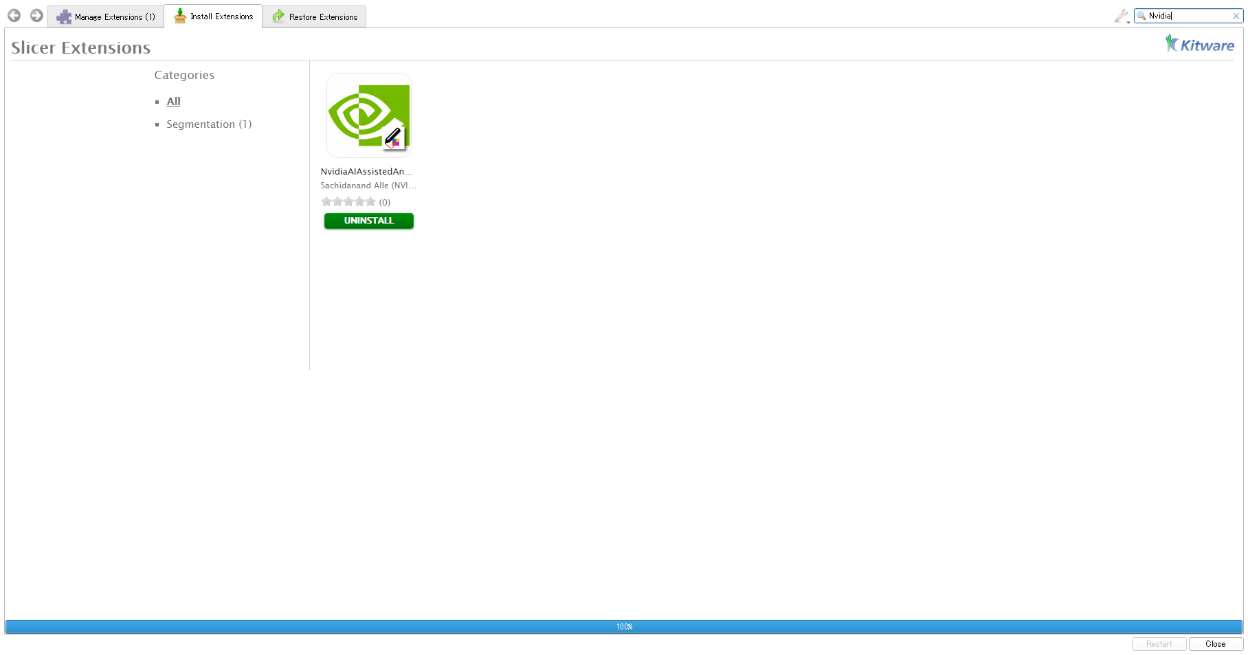 起動するとこのような画面になるので、まずは、Nvidia AIAA Extension をインストールしましょう。Install Slicer Extensions を選択し、Nvidia と検索すると