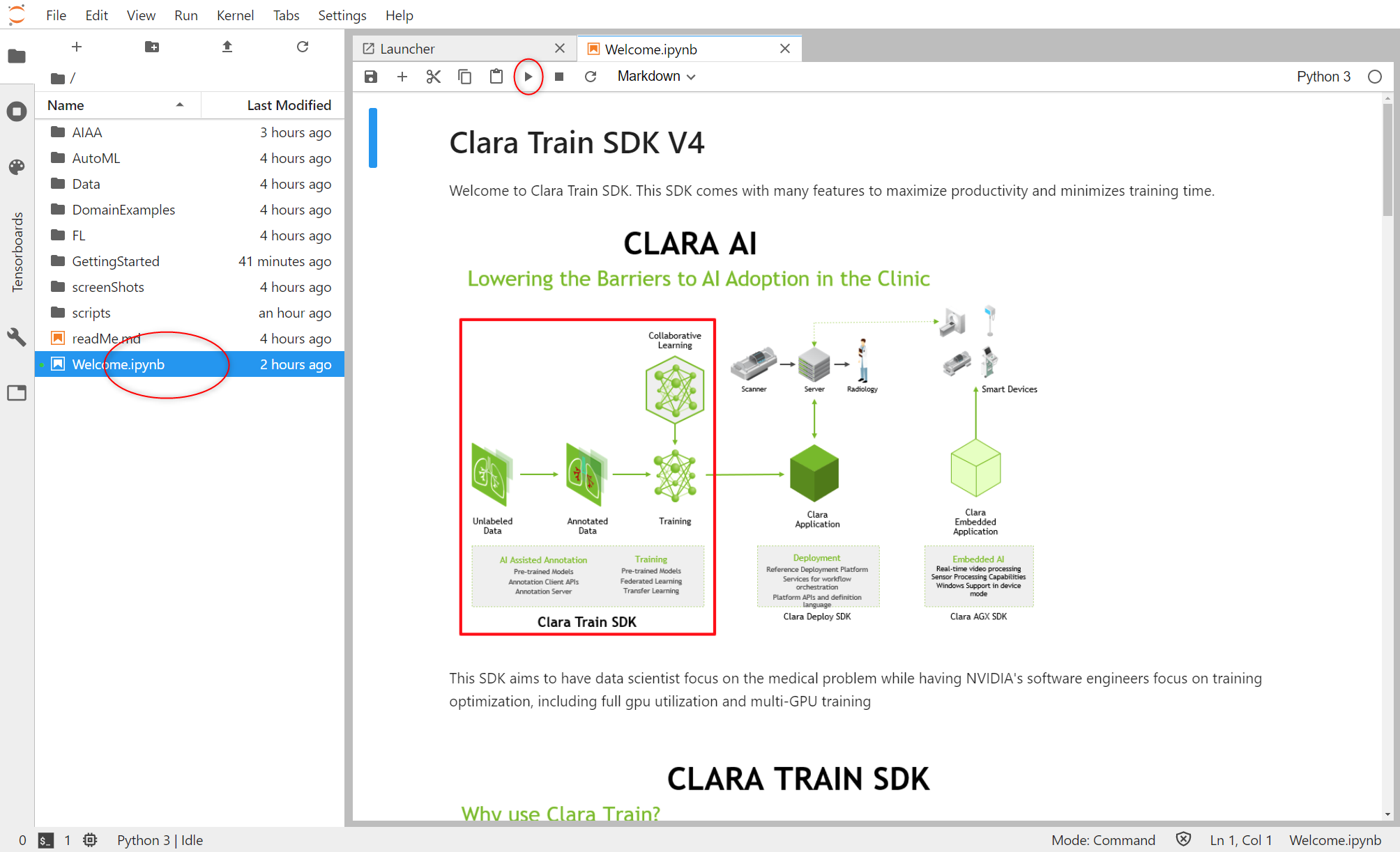 準備編では、jupyter note book の起動まではできました。v3.1 の時と同じように、Welcome.ipynb を開き、チュートリアルをPlay ボタン(➤)で進めてゆきます。