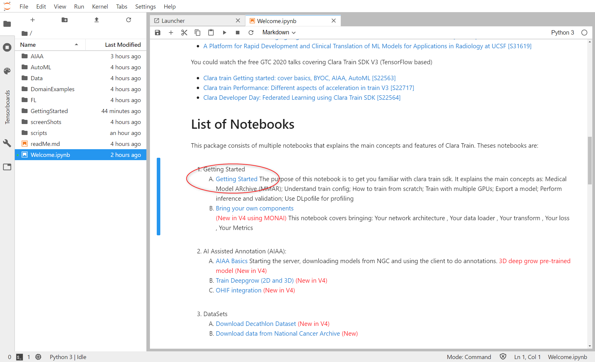 そうはいっても何から始めていいのかわからないので、まずは、Getting Started から始めましょう。全編英語ですが、GTC2021 Postworkshop で Clara v4.0 の説明とトレーニングがありました。その内容には、