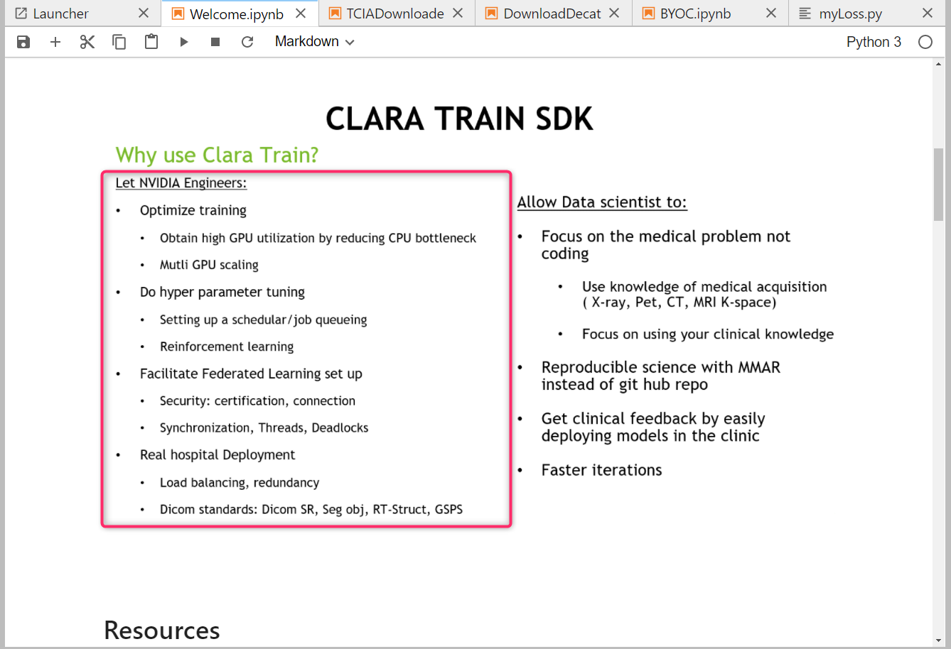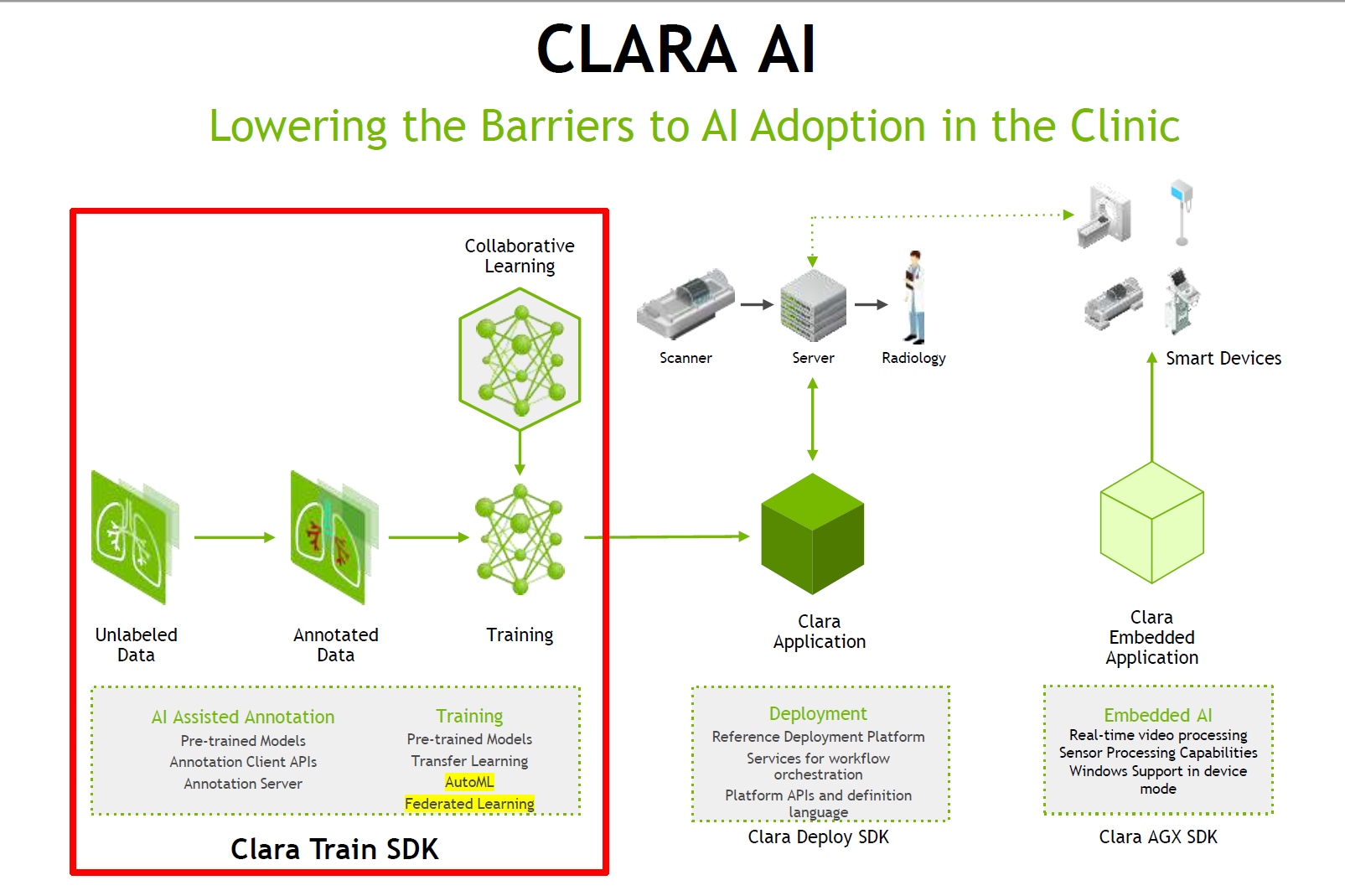 Clara Train SDK が一体なんであるかについては、赤枠にある通り、CT、MNR などで取得した多量の画像データに対して、アノテーション(情報の付与)が行われたデータにするため、すでに学習されたデータに基づき AI による補助を行います。そのデータを収集し、逐次学習する意図により解析制度を上げ次の段である、アプリケーション層につなげるのが役割となります。Clara という名称は現在巨大な系を形成し、データの学習から、末端端末(スマホやロボットのカメラ)などから情報を収集する通観したシステムの総称になっています。すべての系を一つのまとまりで開設することもできませんので、ここでは、 Train SDK についてはじめの一歩を説明しております。