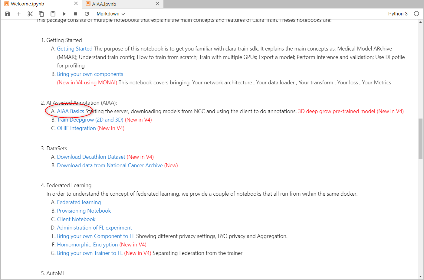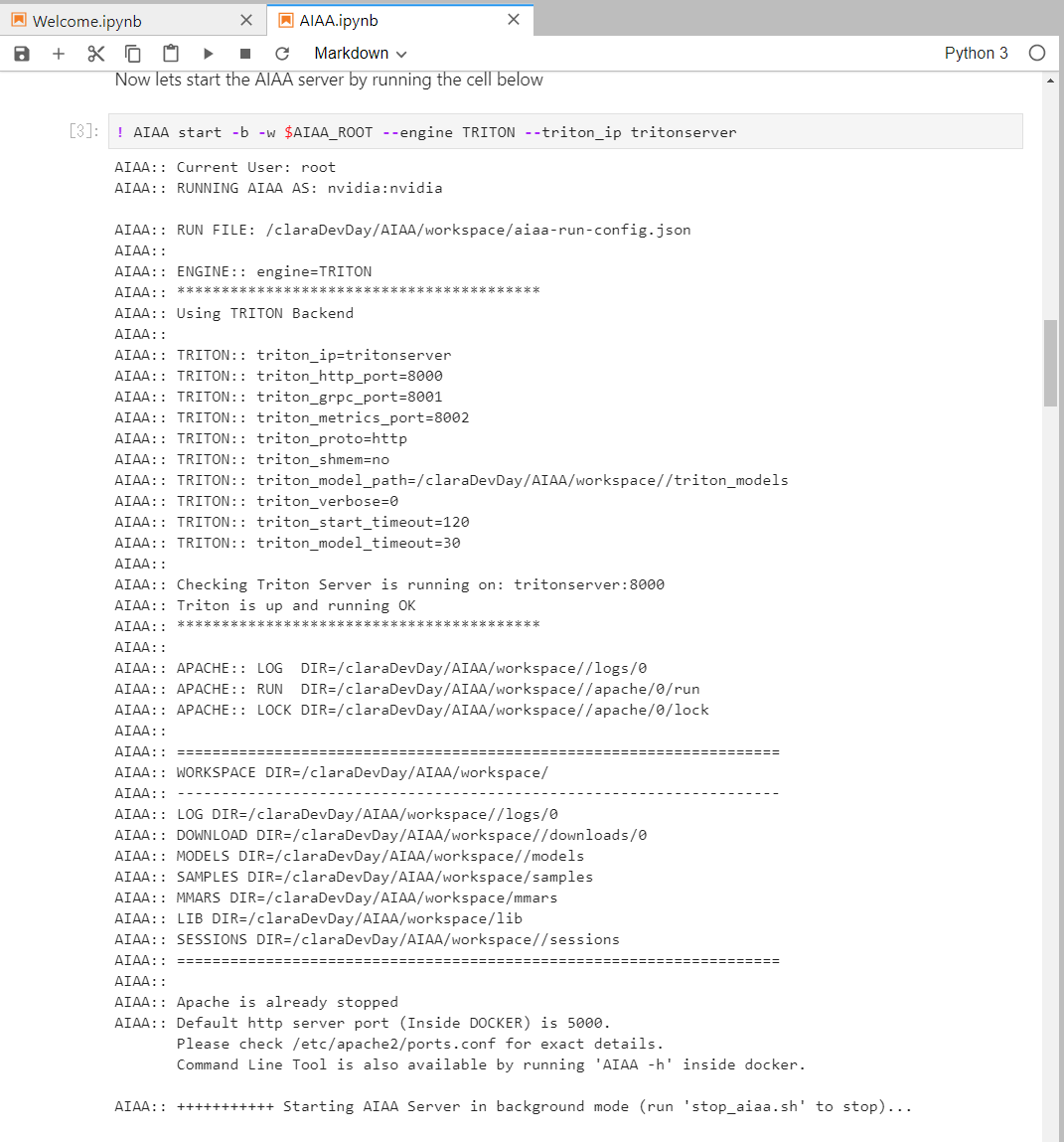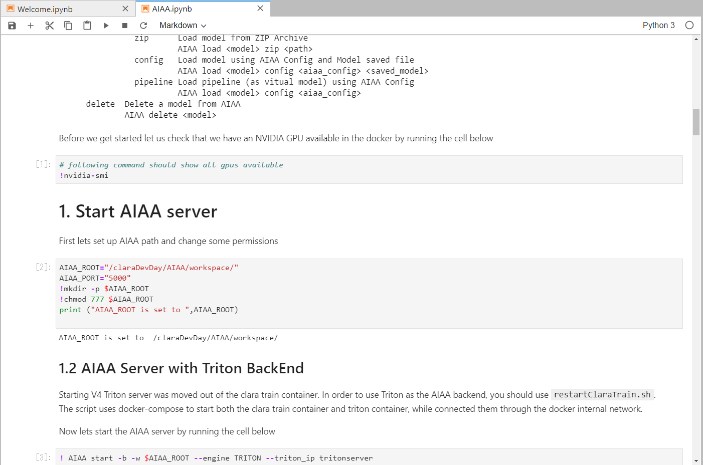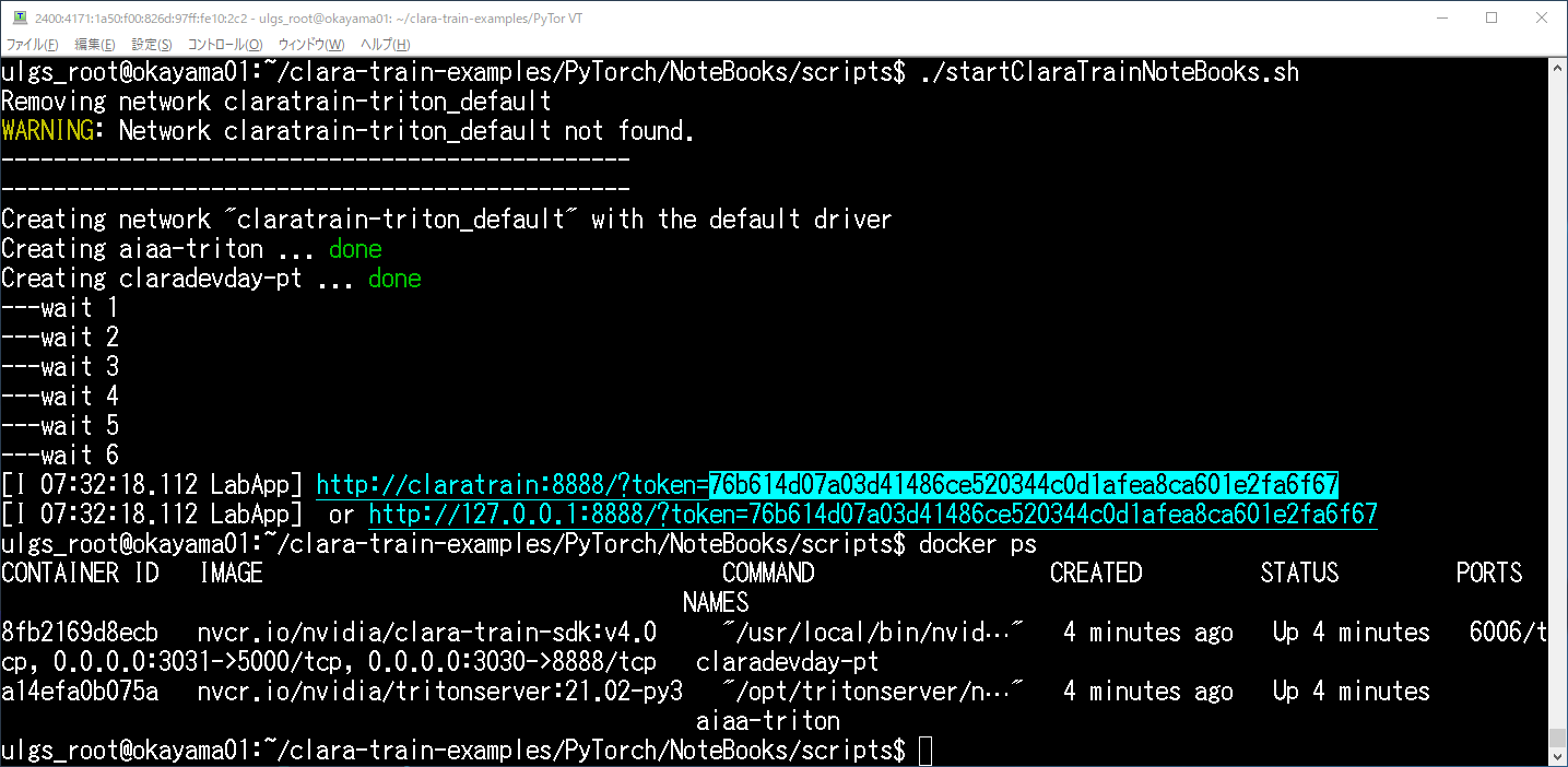 V3 と V4 ではAIAAサーバーの起動方法が異なります。V3 では docker コンテナで起動していましたが、V4 では tritonserver を使用するため、複数のコンテナを起動させる docker-compose が必要になってきます。コマンドプロンプト上では、startDocker.sh ではなく、一度 docker コンテナを停止して、startClaraTrainNoteBooks.sh を実行し、AIAA-triton と claradevday-pt を起動させる必要があります。
