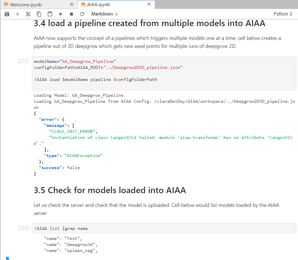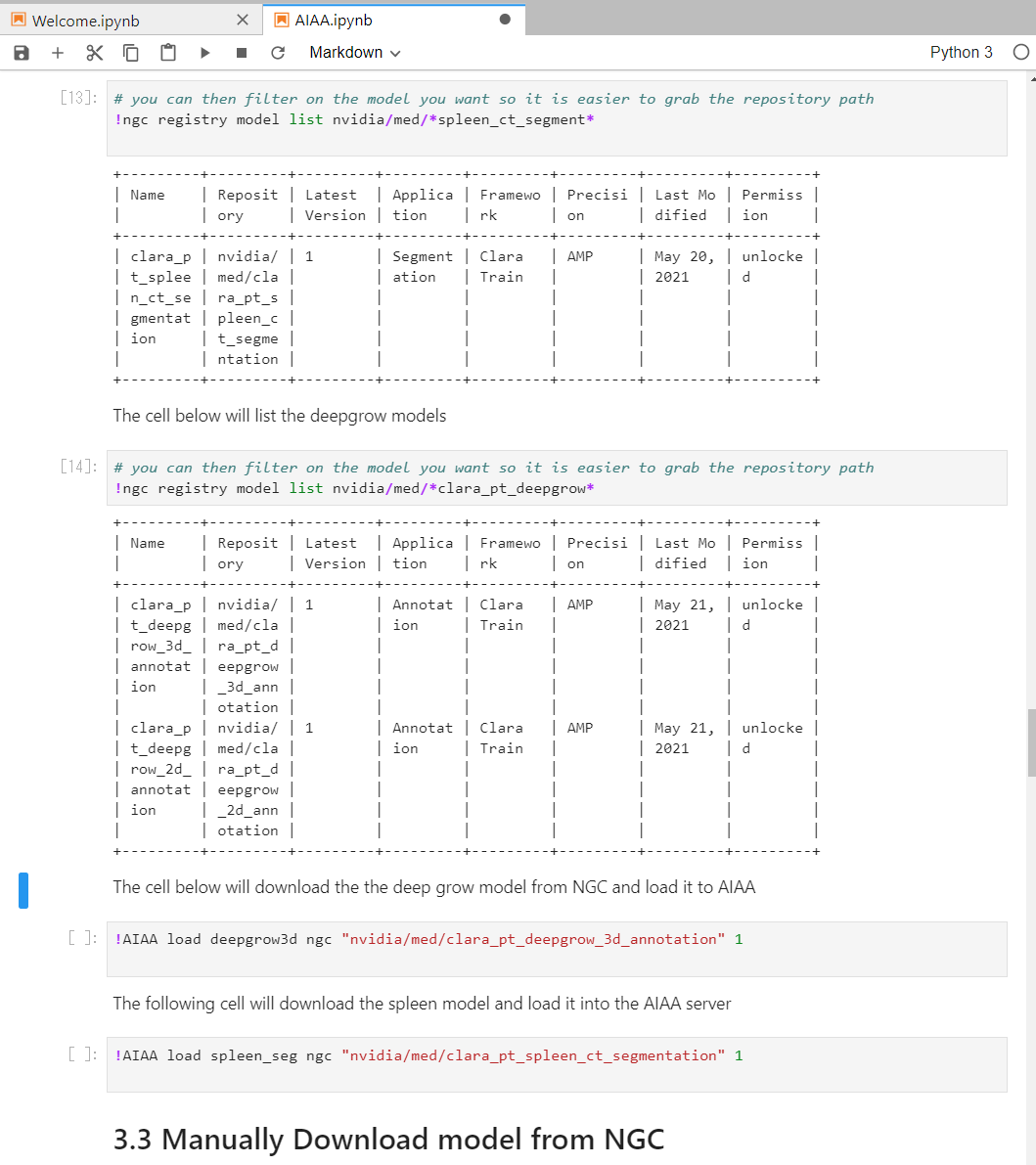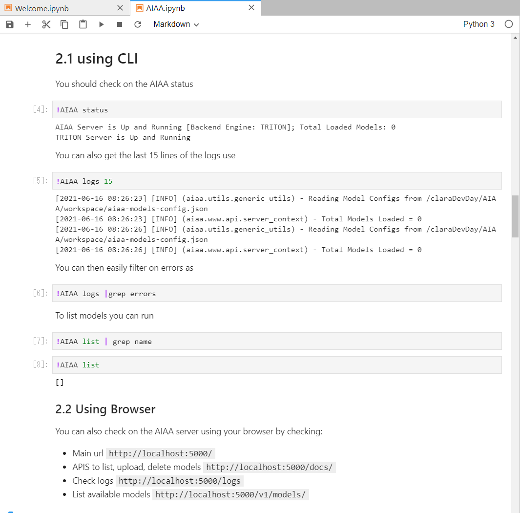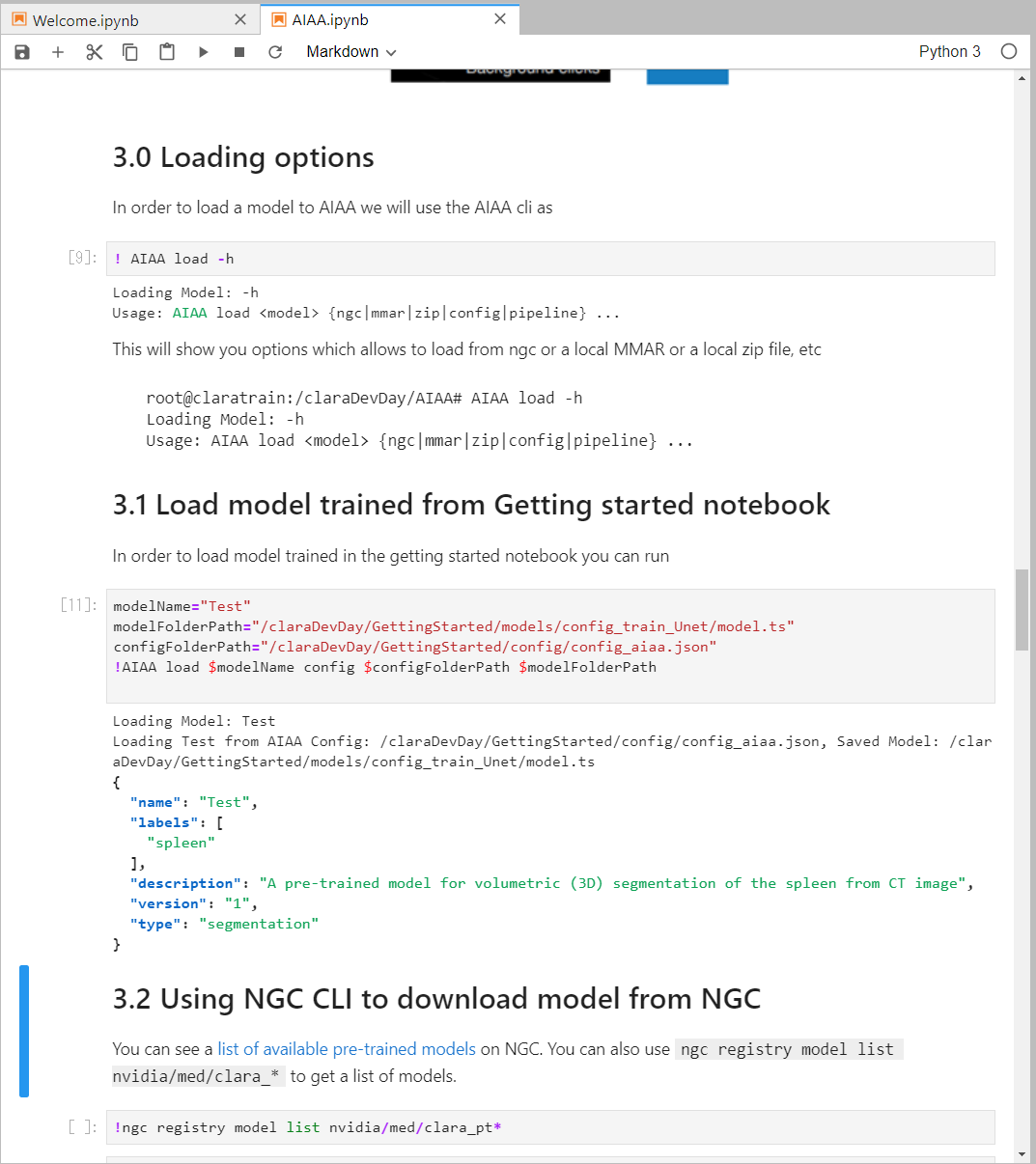 V3 と V4 ではAIAAサーバーの起動方法が異なります。V3 では docker コンテナで起動していましたが、V4 では tritonserver を使用するため、複数のコンテナを起動させる docker-compose が必要になってきます。コマンドプロンプト上では、startDocker.sh ではなく、一度 docker コンテナを停止して、startClaraTrainNoteBooks.sh を実行し、AIAA-triton と claradevday-pt を起動させる必要があります。
