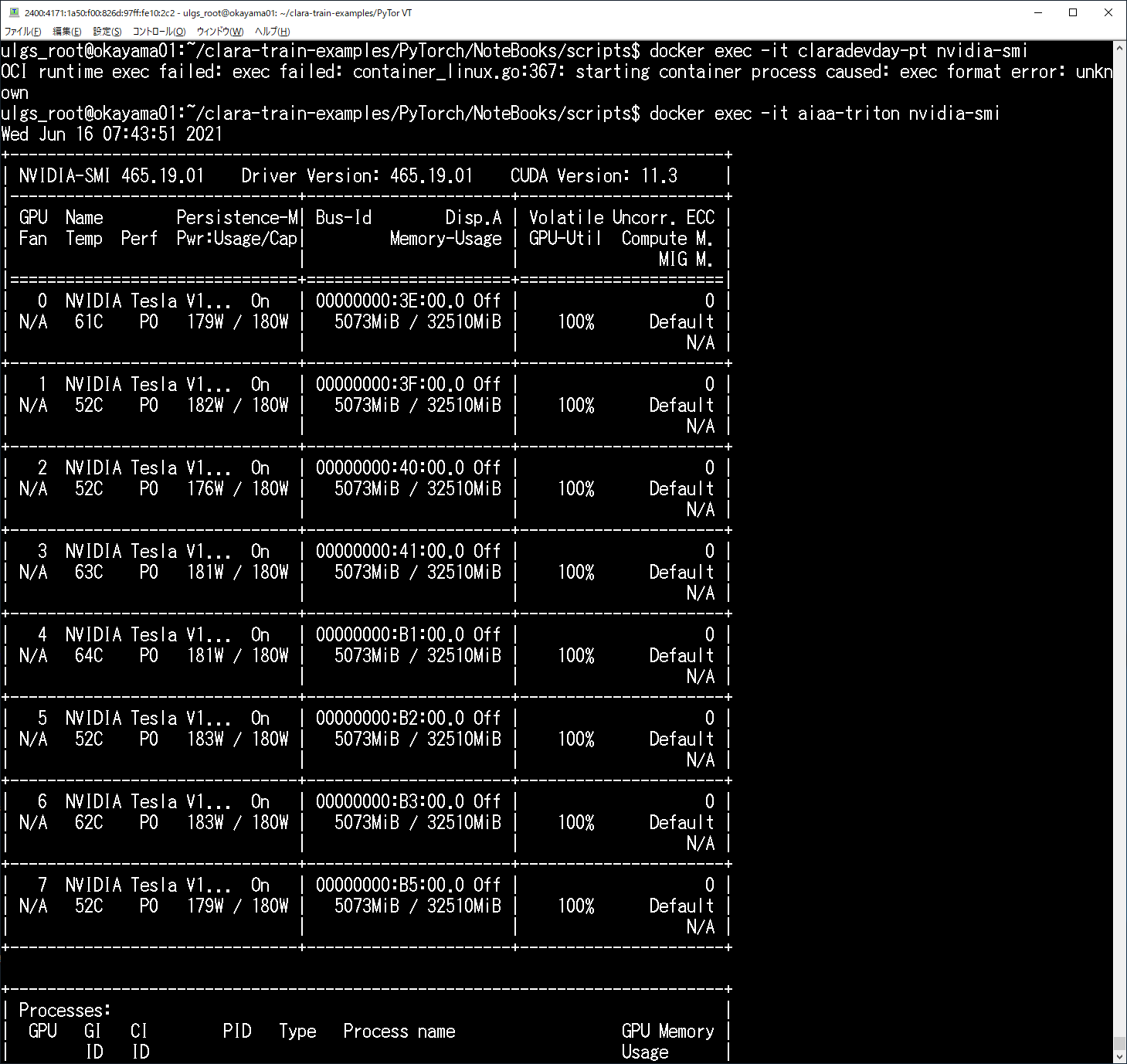 では、AIAA を始めてゆくのですが、nvidia-smi の反応はあるはずがありません。割り当たってなのですから!