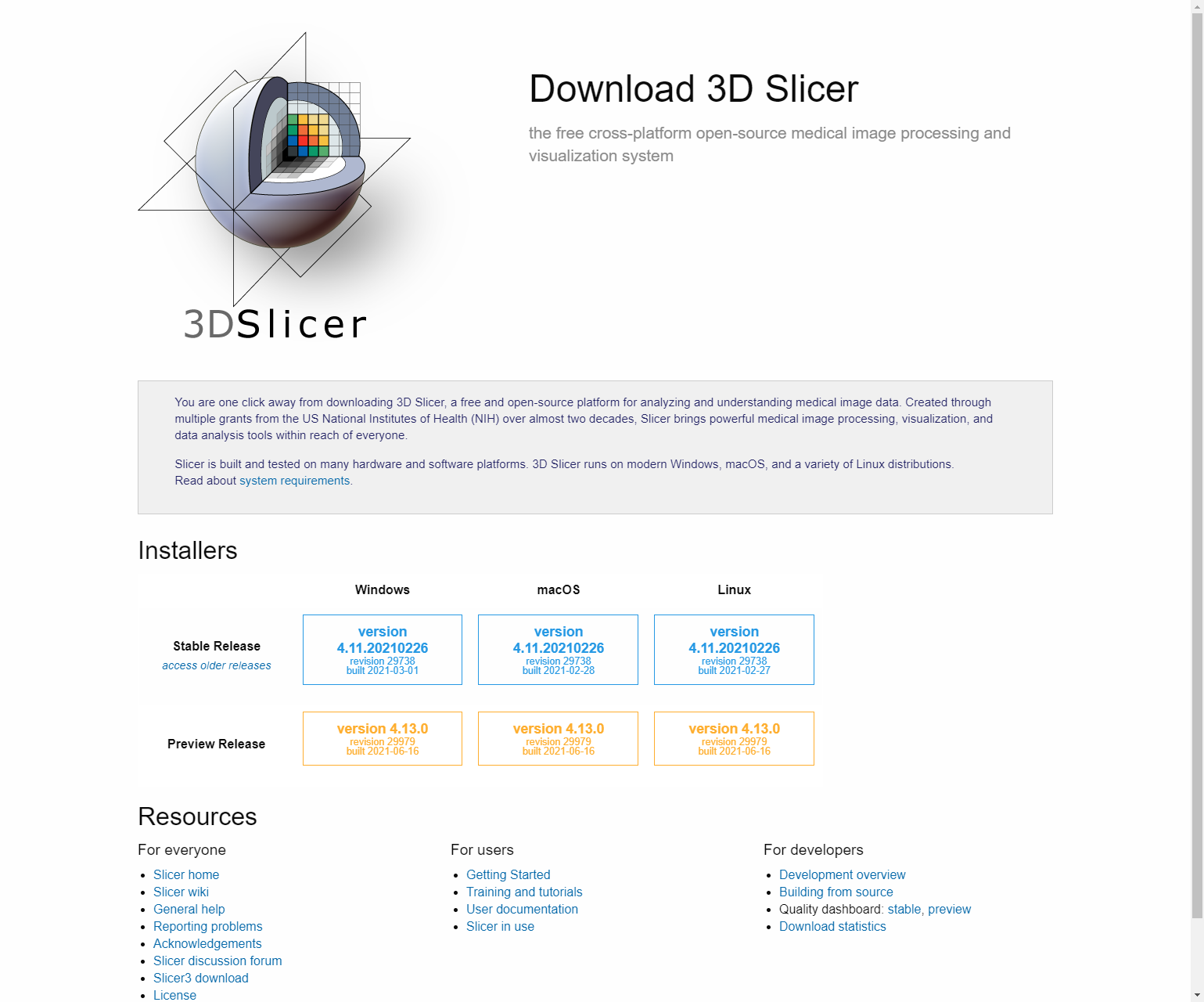 さてこれで、一通りはサーバー側の確認はできたと思います。ここから先は、手元のクライアントからの操作となります。3D Slicer をダウンロードしてインストールを行ってください。